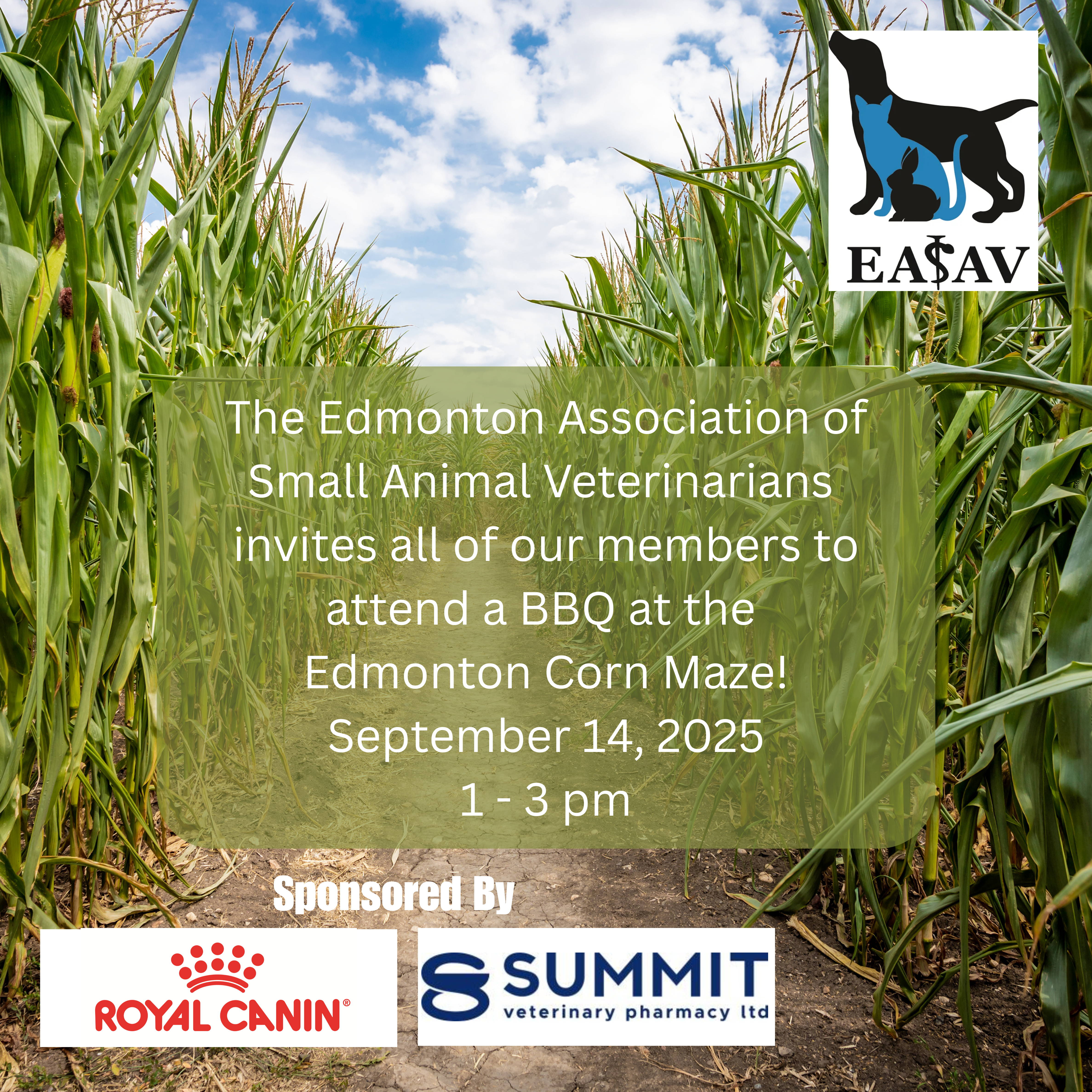 The Edmonton Association of Small Animal Veterinarians would like to invite all of our members to join us at a BBQ and social event! Please come mingle and enjoy the company of your peers! Food and admission will be covered by EASAV and Royal Canin! Where: Edmonton Corn Maze 51529 Range Rd 262, Spruce Grove, AB Time: 1-3 pm *Please inform us of any dietary restrictions Jodymae Brown, RVT, Executive Assistant
