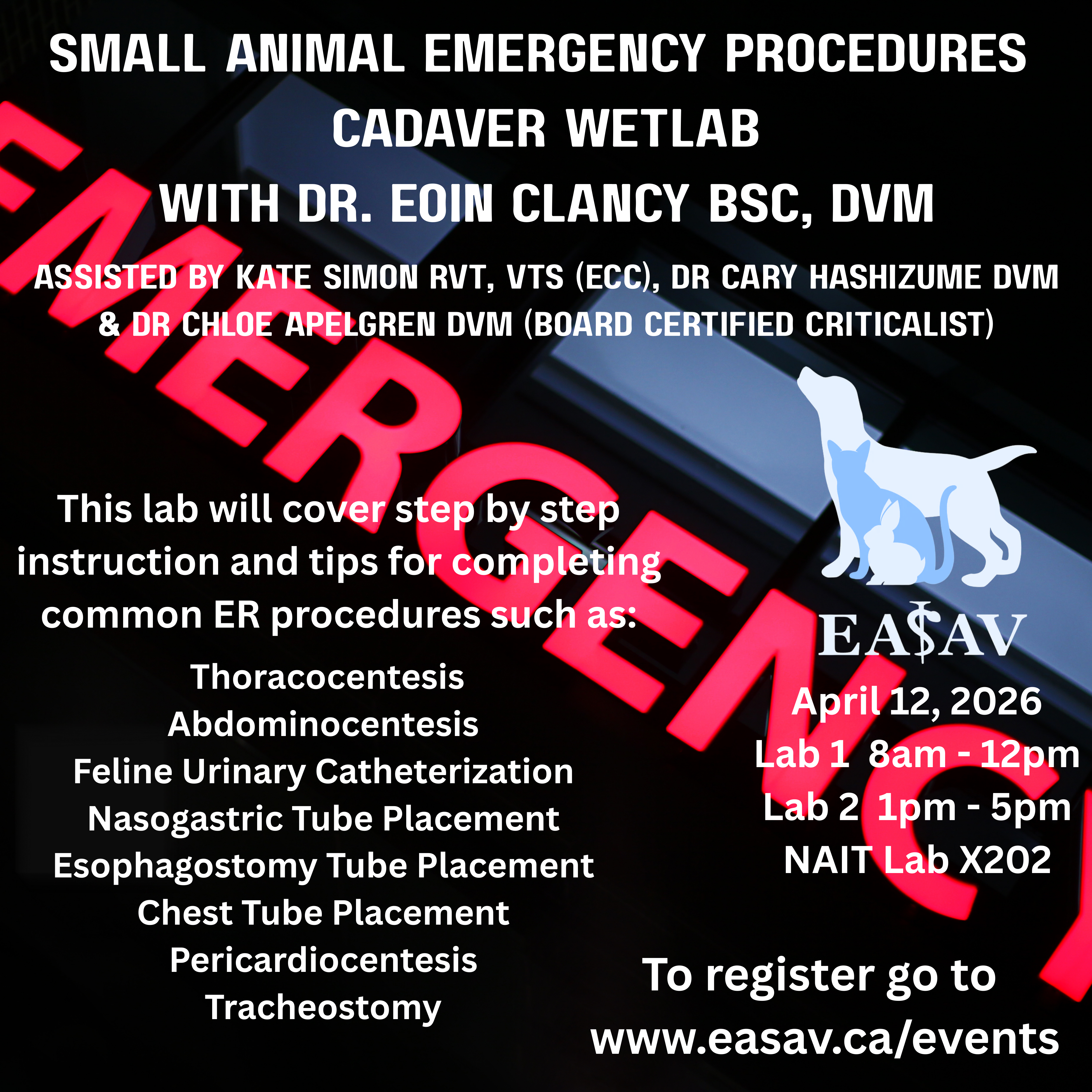 EASAV is excited to announce our upcoming hands on lab! Sunday April 12, 2026 Location: NAIT This lab will cover step by step instruction and tips for completing common ER procedures such as: Meet Dr. Clancy! Cancellation Policy - Cancelling attendance to a wetlab will result in the forfeit of 100% of wetlab fees unless the attendant finds a replacement attendee. Jodymae Brown, RVT, EASAV Executive Assistant
