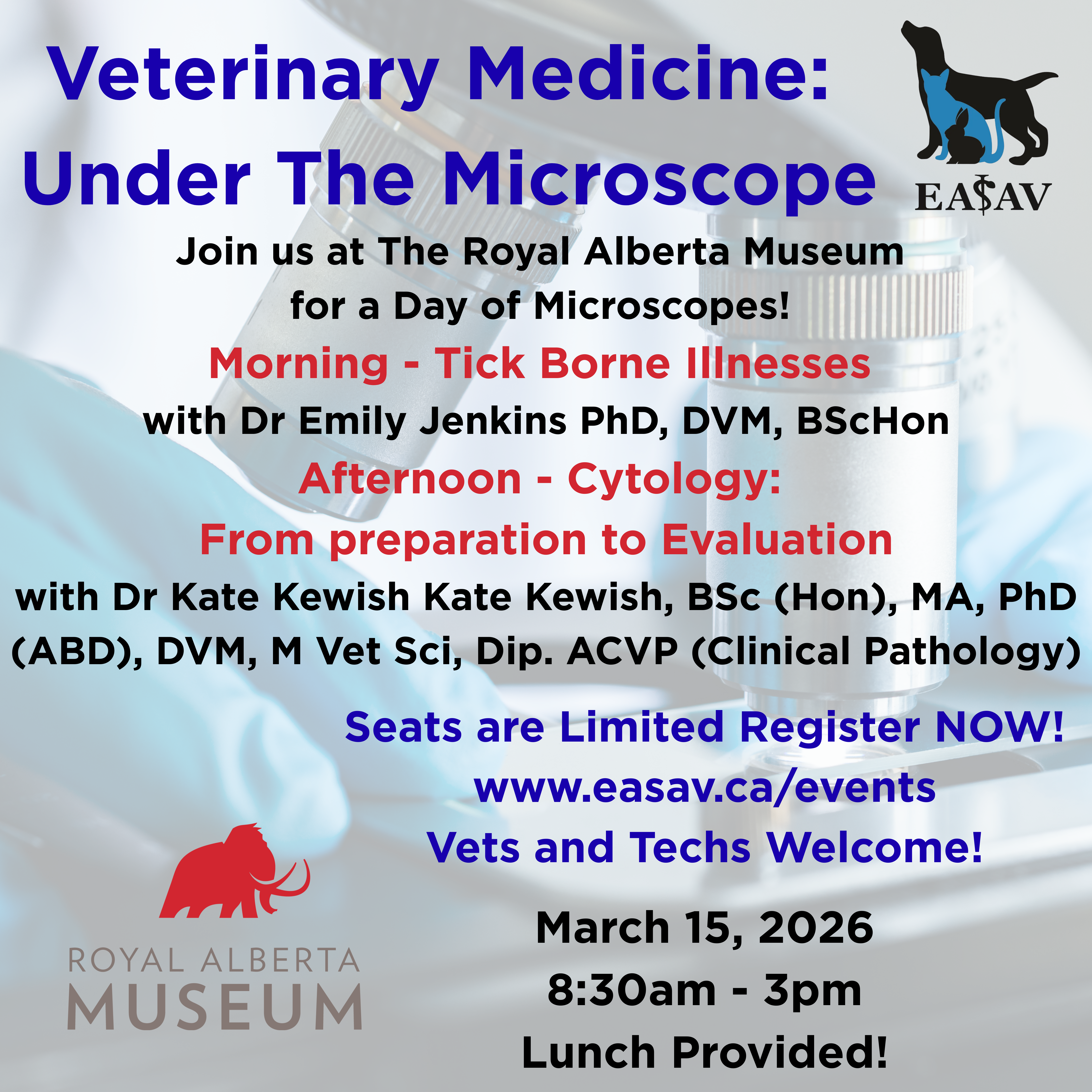 This wetlab is pending approval by The ABVMA and CVBC for 5 hours of CE Credits. Sunday March 15, 2026 Location: Royal Alberta Museum 8:30am - 3pm Cancellation Policy - Cancelling attendance to a wetlab will result in the forfeit of 100% of wetlab fees unless the attendant finds a replacement attendee. Jodymae Brown, RVT, EASAV Executive Assistant