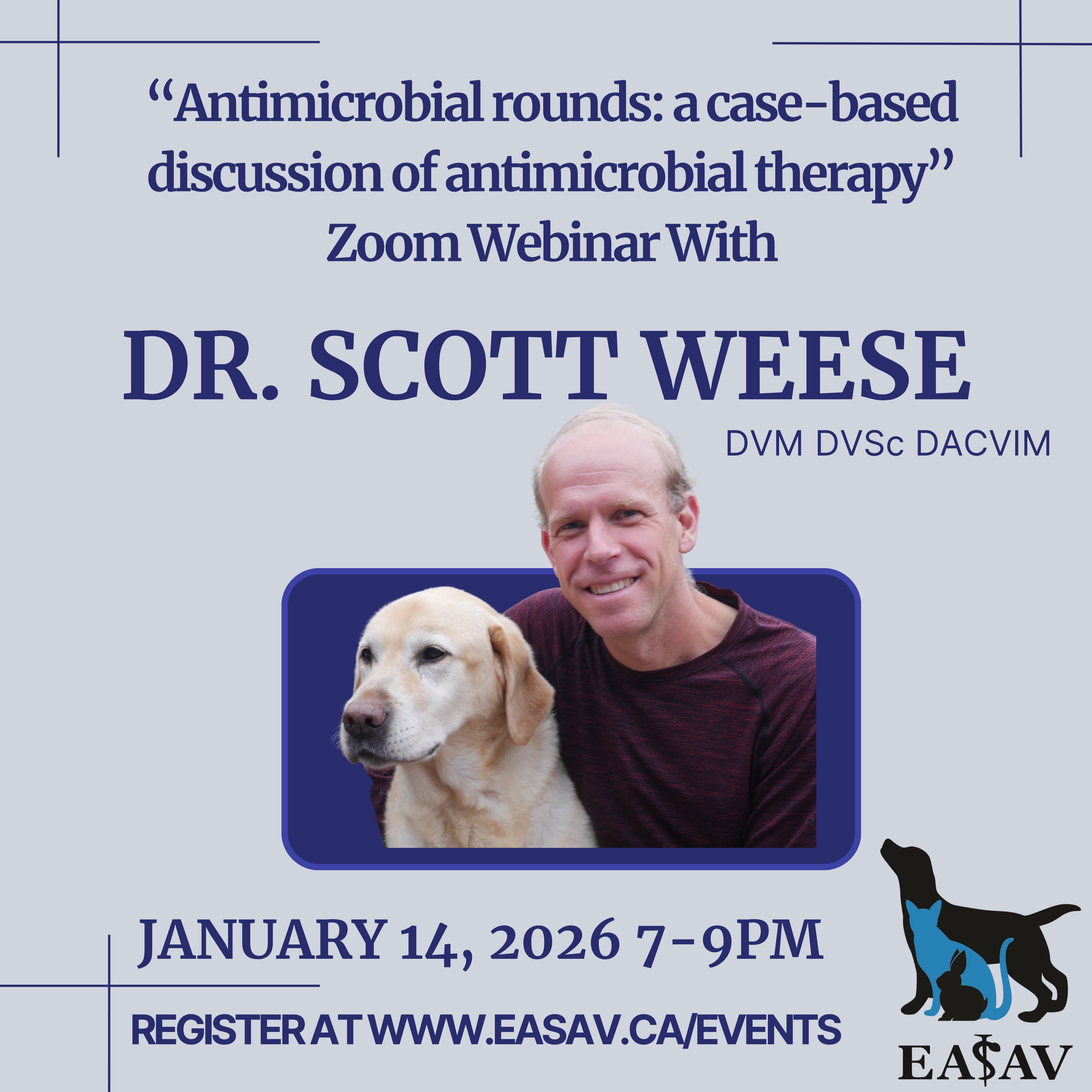 Dr Weese Bio - J. Scott Weese, DVM DVSc DipACVIM, is a veterinary internist and microbiologist, and a Diplomate of the American College of Veterinary Internal Medicine. He is a Professor at the Ontario Veterinary College, University of Guelph and a Zoonotic Disease/Public health Microbiologist at the University of Guelph’s Centre for Public Health and Zoonoses. He is also Chief of Infection Control at the Ontario Veterinary College Teaching Hospital and holds a Canada Research Chair in zoonotic diseases. Dr. Weese has authored or co-authored over 200 papers in peer reviewed journals, edited two books and speaks extensively on infectious disease topics. His research interests include Clostridium difficile, microbiome assessment, surgical site infection, antimicrobial resistance, methicillin-resistant staphylococci, infection control, emerging diseases and zoonoses. Fees: