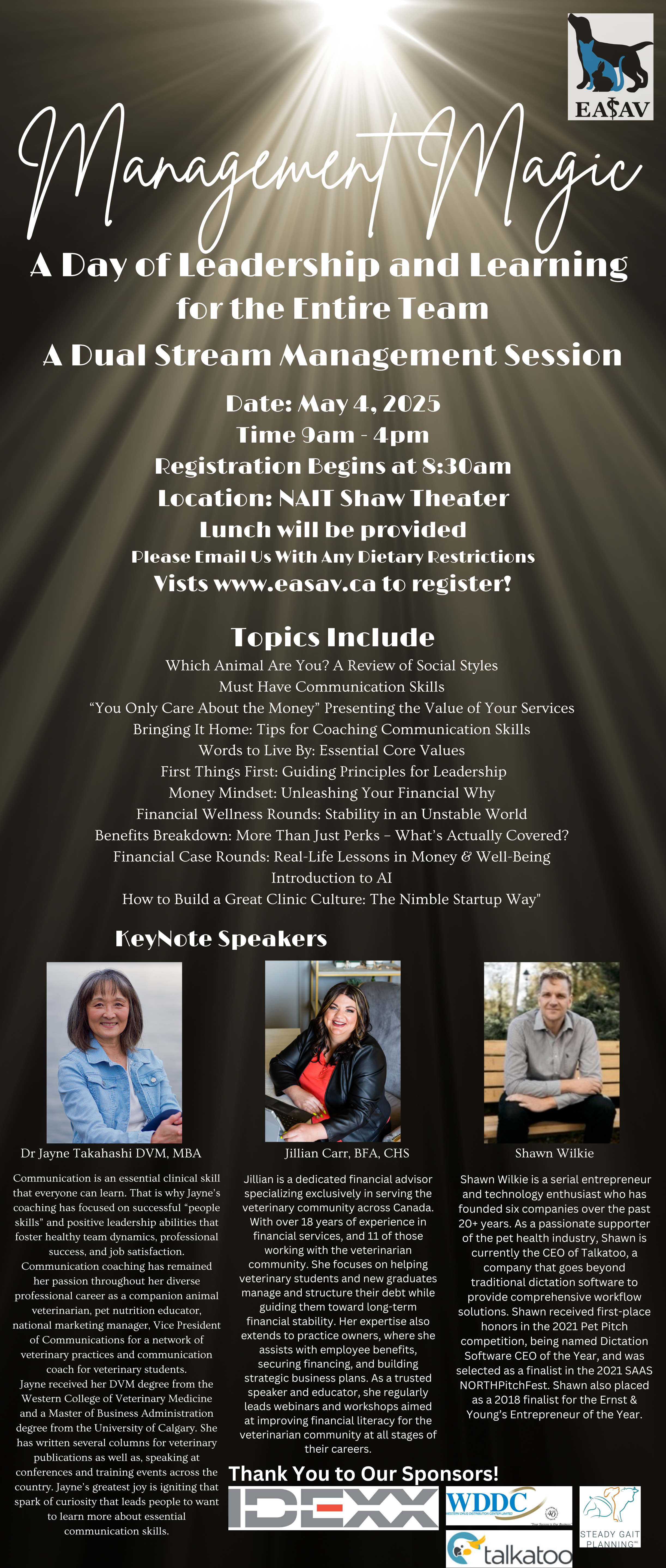 "Extraction lab for the Beginner" Dental Cadaver Wetlab There is a prerequisite for this course. Once registration and payment are complete you will be sent a link with your prerequisite course material. The prerequisite course is ABVMA and CVBC approved for 3 hours of CE credit. Location: NAIT In this hands-on introduction to tooth extractions, we will work through the basic steps for successful tooth extraction. This includes mucogingival flap creation and elevation, buccal bone removal, tooth sectioning, luxation/elevation, alveoloplasty, periosteal release, and proper closing techniques. Cancellation Policy - Cancelling attendance to a wetlab will result in the forfeit of 100% of wetlab fees unless the attendant finds a replacement attendee. Jodymae Brown, RVT, EASAV Executive Assistant